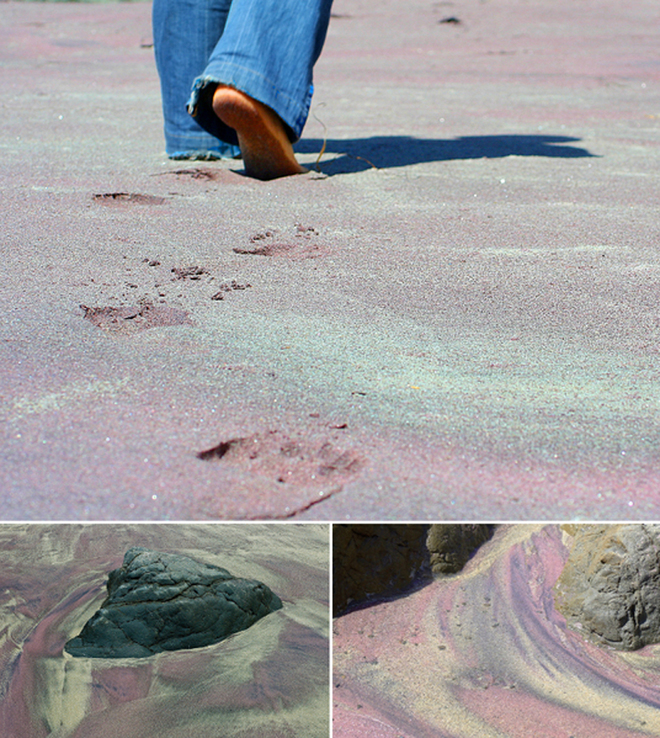 Cát tím trên bãi biển này được hình thành bởi quặng garnet trên các ngọn đồi xung quanh, bị xói mòn xuống biển tạo nên bãi cát màu tím thơ mộng.